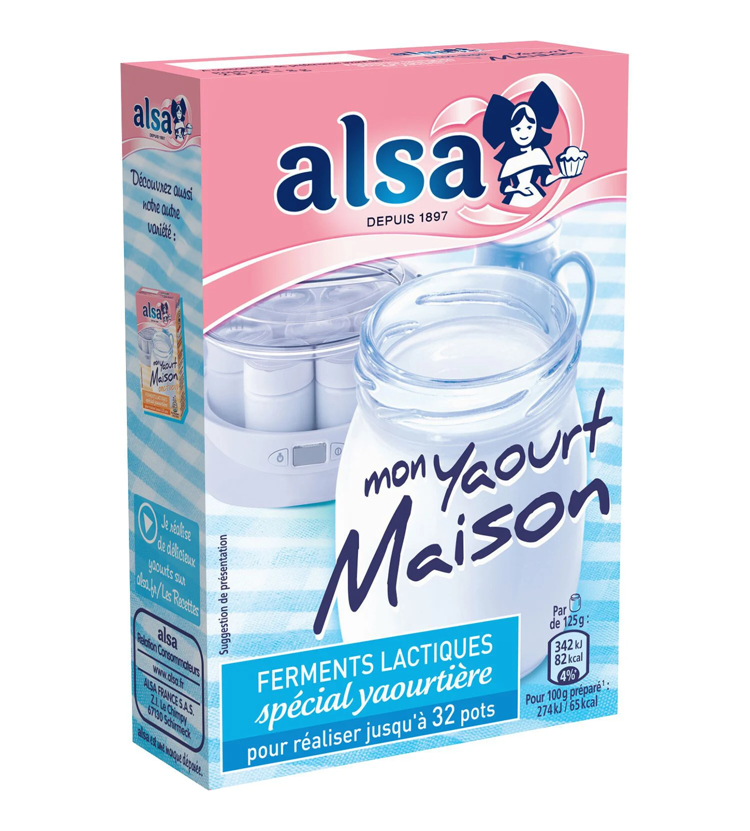 Alsa - Mon Yaourt Maison 8g - Quick and easy yogurt preparation Thanks to Alsa lactic ferments, there's no need to use store-bought yogurt to make your own! Just pour one sachet into 1 L of milk, cook for 8 hours and you're ready to go! - Mild taste; - For easy, homemade yoghurt that's easy to make; - Recipe ideas inside every pack; - For up to 32 pots.