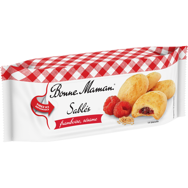 Discover this gourmet recipe created for you by Bonne Maman: raspberry-filled shortbread sprinkled with sesame seeds. Its resealable packaging preserves the flavors of the cookies right up to the last bite. Made in France, they contain no colorants or preservatives.