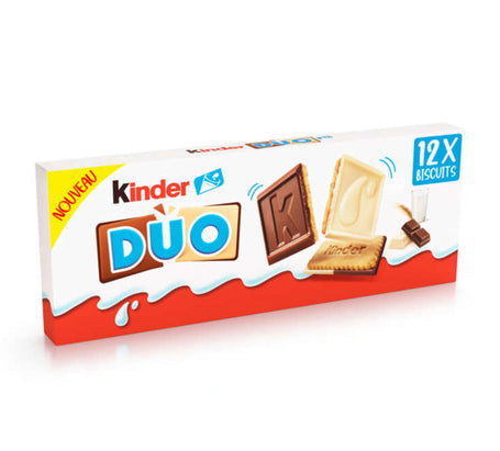 Kinder Duo is a crunchy cookie covered with a bar of two chocolates, milk and white. Each package contains a tray of 12 cookies, ideal for sharing.