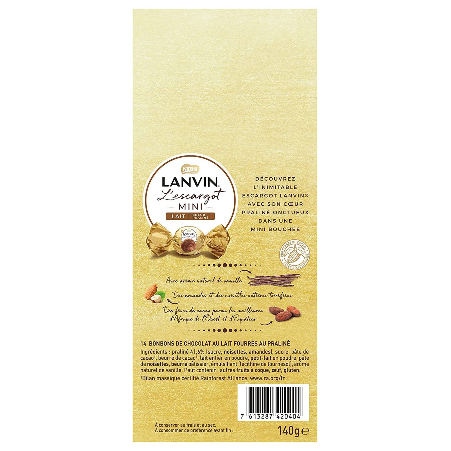 1934 年にブルゴーニュで誕生した LANVIN Snail は、ローストしたアーモンドとヘーゼル ナッツから作られたなめらかなプラリネと、おいしいミルク チョコレート シェルであなたを魅了します。比類のないランバン プラリネが明らかになります... この豊かでフルーティーなプラリネは、口の中でなめらかで、口の中でとろけます。厳選されたアーモンドとヘーゼル ナッツの慎重に測定された混合物で構成され、繊細にローストされて口の中でアロマを昇華させます。